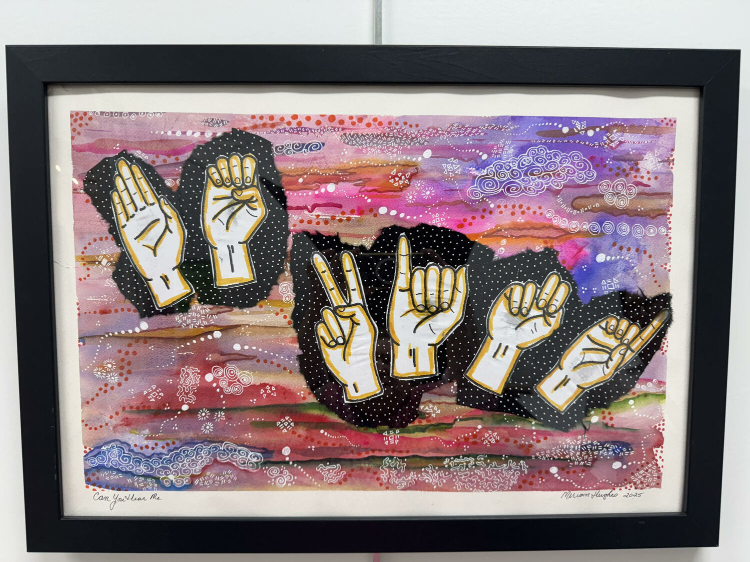 Miriam HughesCAN YOU HEAR MEMIXED MEDIA COLLAGE AND WATER COLORFramed: 17 x 24 x 1 ″